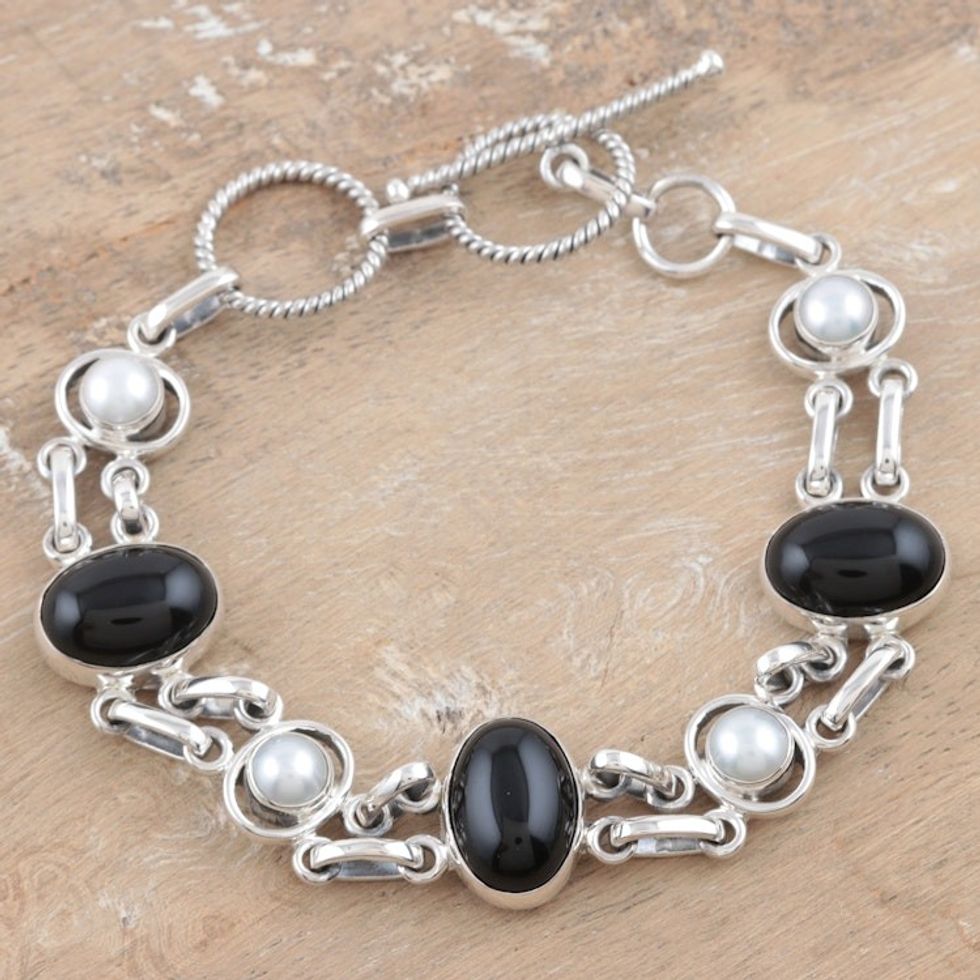 Pearl and onyx link bracelet 'Jaipur Night' Item ID: 2669924592