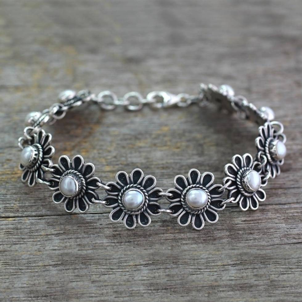 Pearl and Silver Flower Bracelet 'Pristine Blossom' Item ID: 2671794785