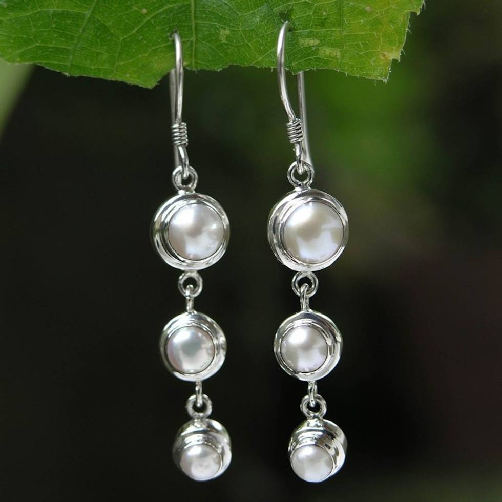 Pearl Sterling Silver Dangle Earrings 'Three Full Moons' Item ID: 2671079751