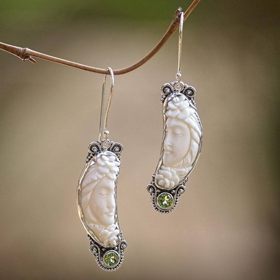 Peridot and Bone Sterling Silver Dangle Earrings 'Rose Queen' Item ID: 2671700616
