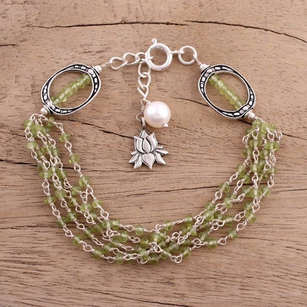 Peridot and Cultured Pearl Beaded Bracelet from India 'Lotus Beauty' Item ID: 2671790870