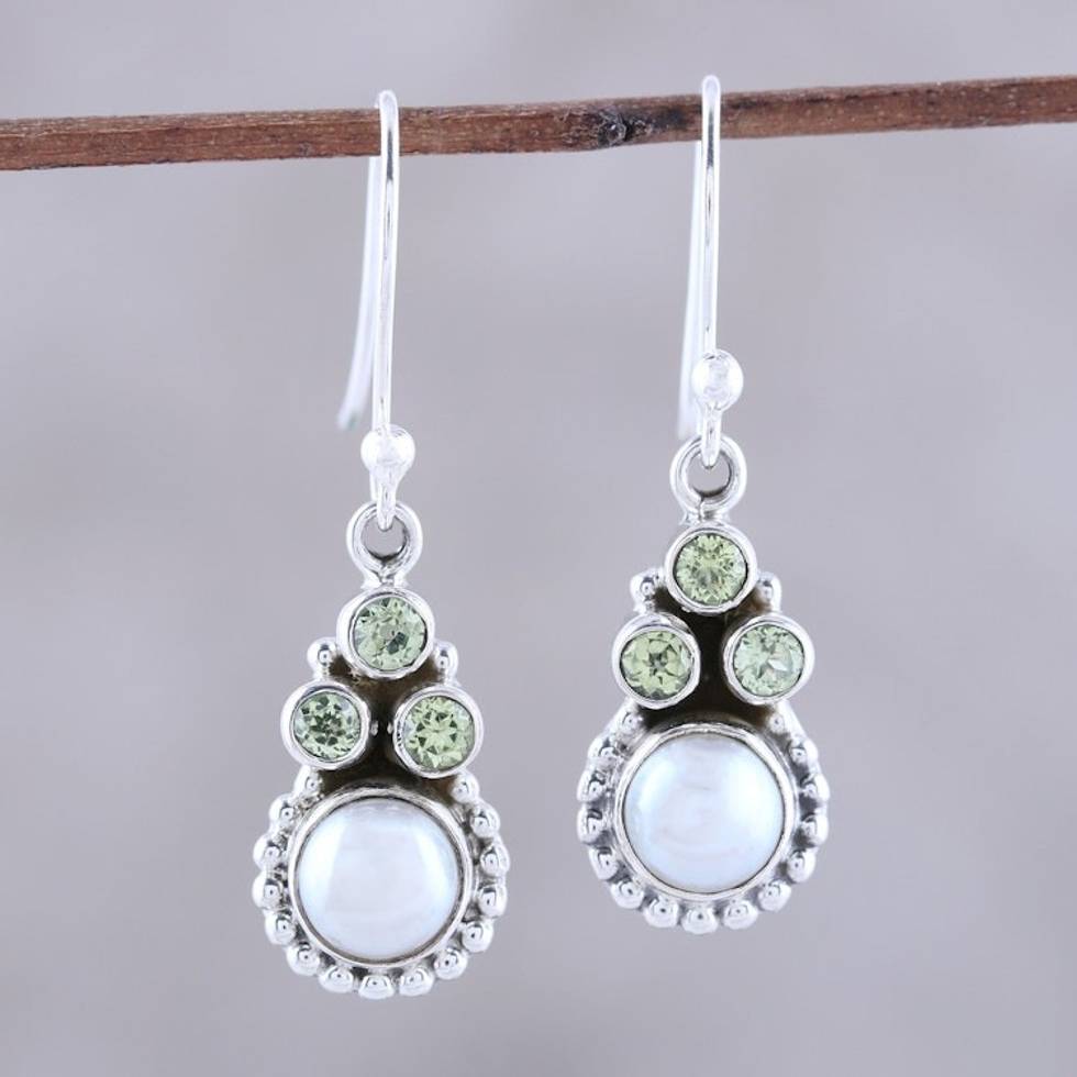Peridot and Cultured Pearl Dangle Earrings from India 'Petite Flowers' Item ID: 2671792804