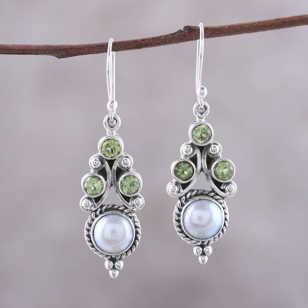 Peridot and Cultured Pearl Dangle Earrings from India 'Verdant Castle' Item ID: 2671792018