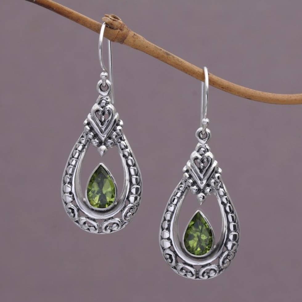 Peridot and Sterling Silver Dangle Earrings from Indonesia 'Dewdrop Temple' Item ID: 2671733453