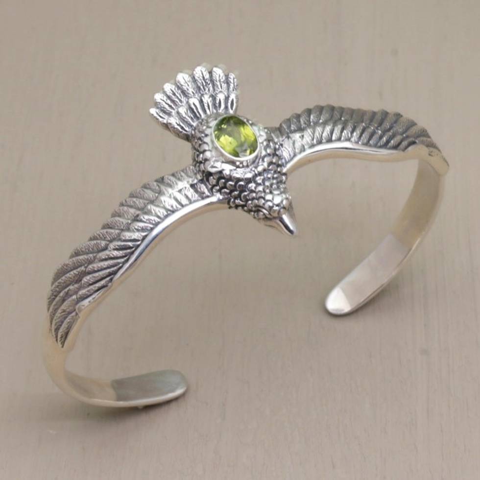 Peridot Hawk Motif Cuff Bracelet in Sterling Silver 'Spirit Hawk' Item ID: 2669921507