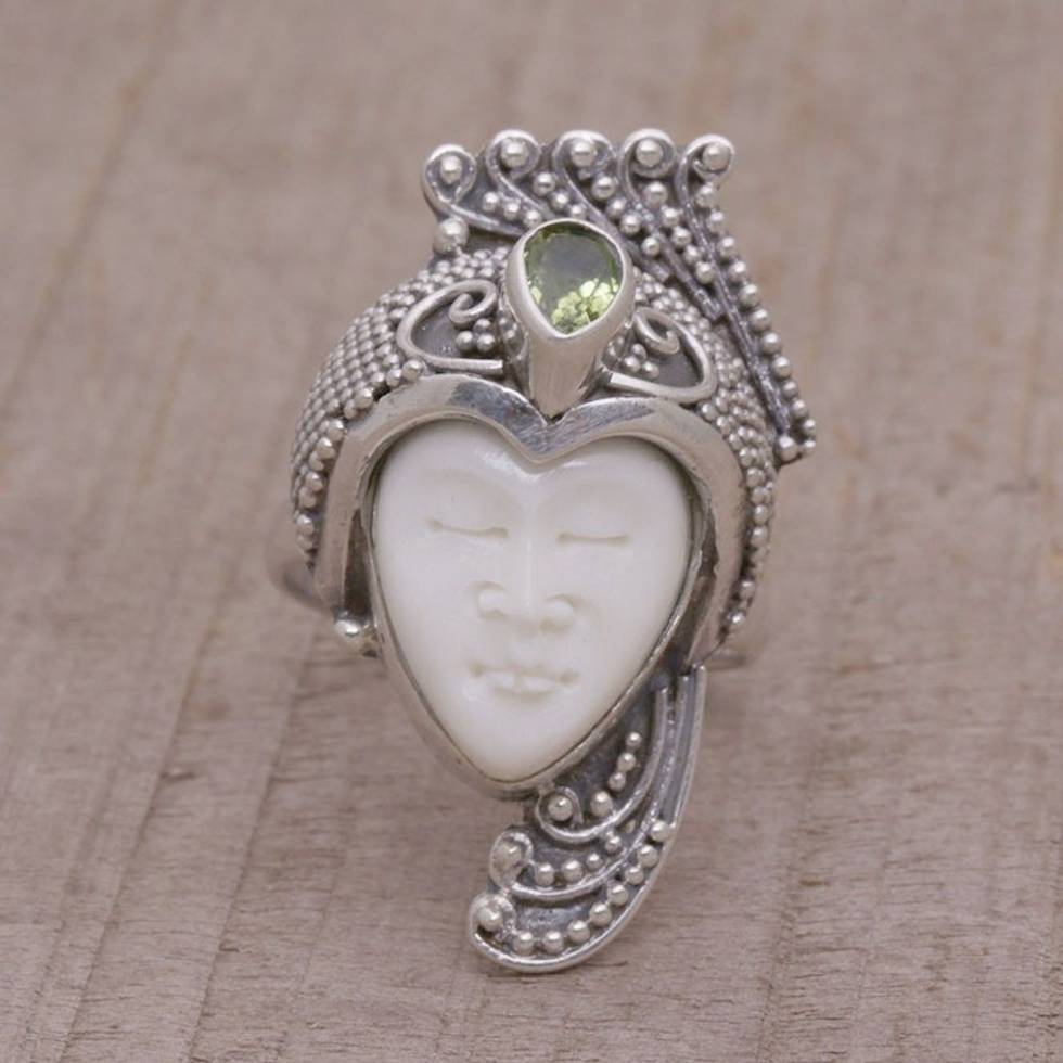 Peridot Sterling Silver and Bone Face Ring from Bali 'Peacock Prince' Item ID: 2671734269