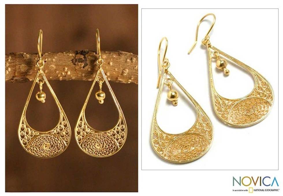 Peruvian 21K Gold Plated Filigree Dangle Earrings 'Teardrop' Item ID: 2669919313