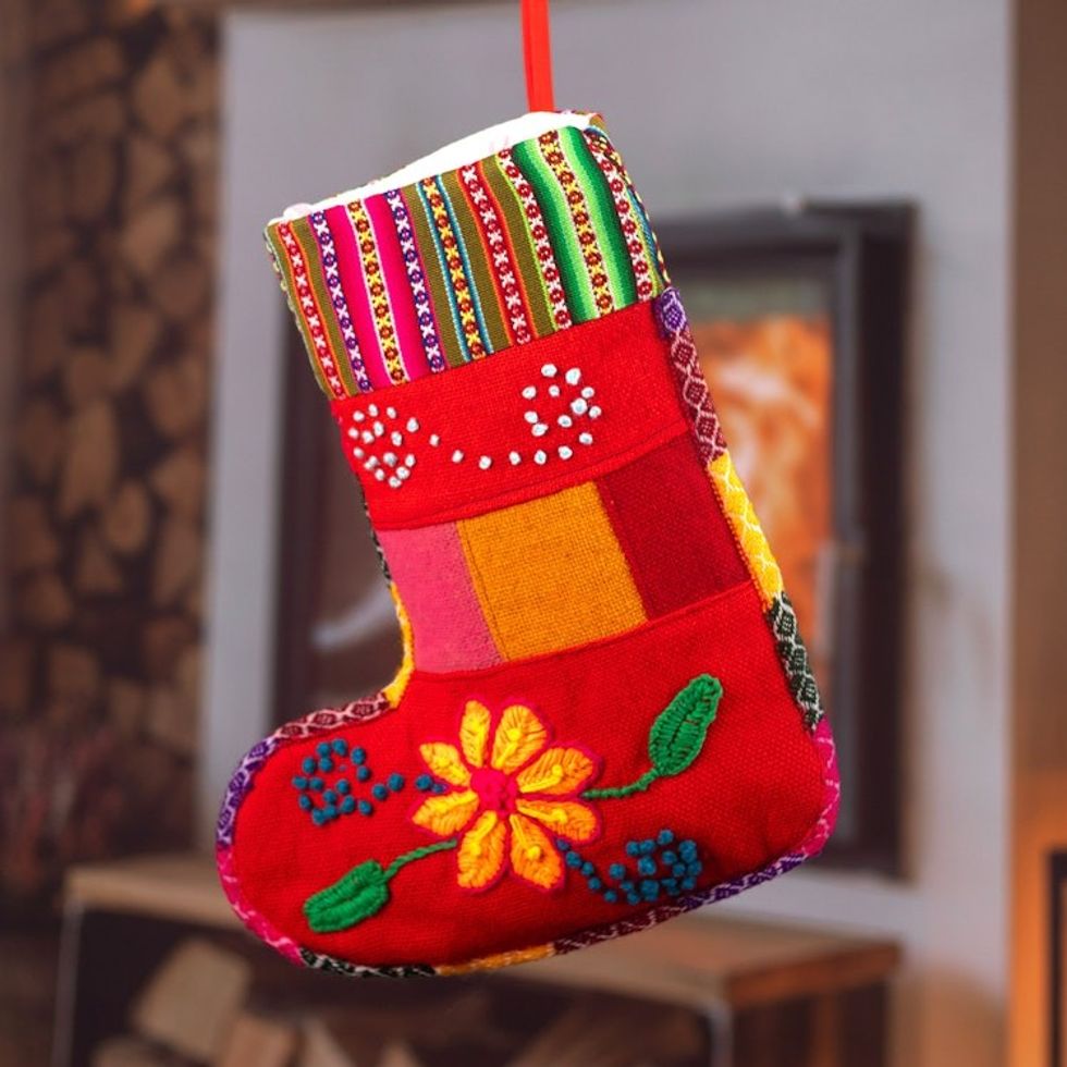 Peruvian Handcrafted Christmas Stocking with Andean Details 'Christmas with Flowers' Item ID: 2671697800