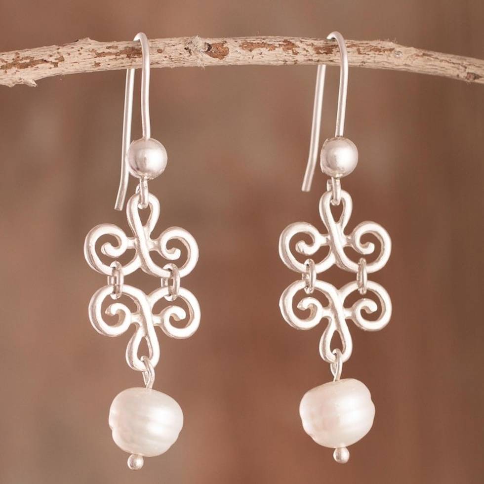Petal Motif Cultured Pearl Dangle Earrings from Peru 'Chic Beauty' Item ID: 2671691402
