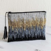 "An elegant clutch handbag is covered with glittering beadwork in black, gold and two tones of silver. The petite evening bag is beautifully crafted by members of the Maya Artists Group. Fully lined, it features a leather tassel on the zipper pull."