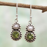 Petite Peridot and Cultured Pearl Silver Dangle Earrings 'Kolkata Sparkle' Item ID: 2671793127