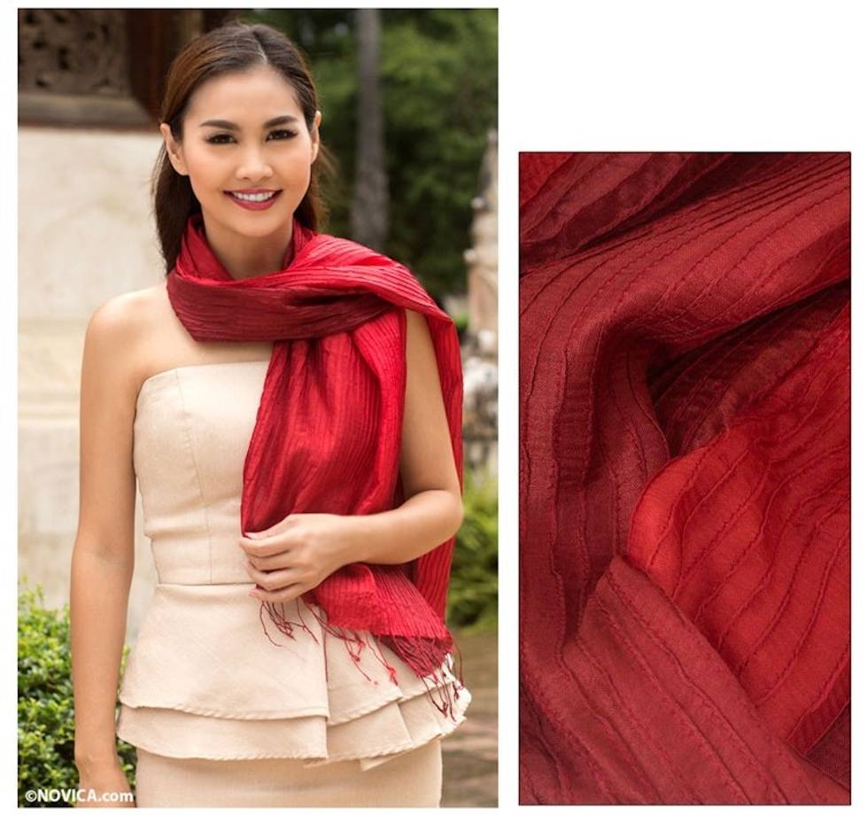 The finely pleated silk is warm but not bulky. It's long enough and wide enough to cover the shoulders as a shawl, but light enough to tuck into the neckline of a V-neck sweater as a scarf.