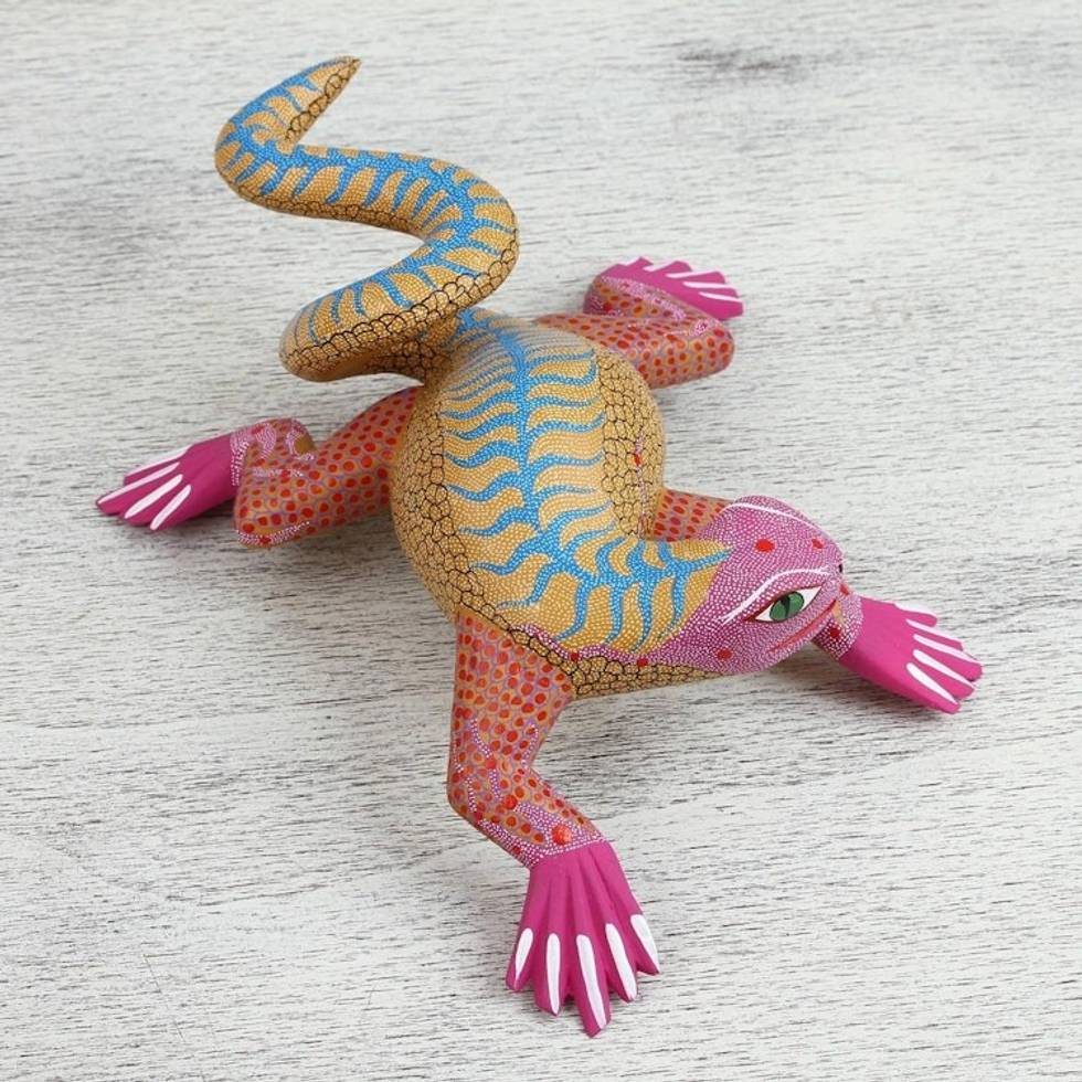 Pink and Yellow Wood Iguana Alebrije Sculpture from Mexico 'Pink Iguana' Item ID: 2671809014