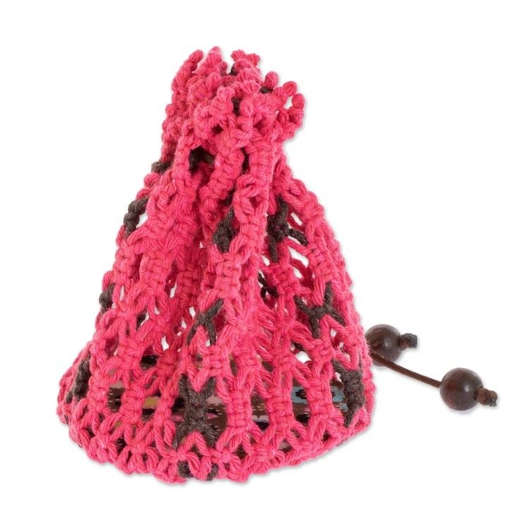 Pink Brown Adjustable Macrame Cotton Pouch with Wooden Beads 'Tropical Rose' Item ID: 2671768832