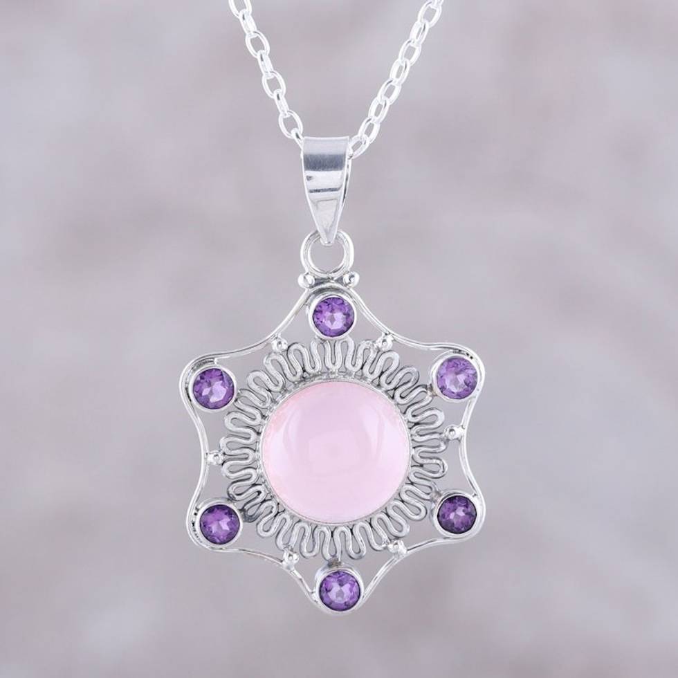 Pink Chalcedony and Amethyst Pendant Necklace from India 'Charismatic Beauty' Item ID: 2671792040