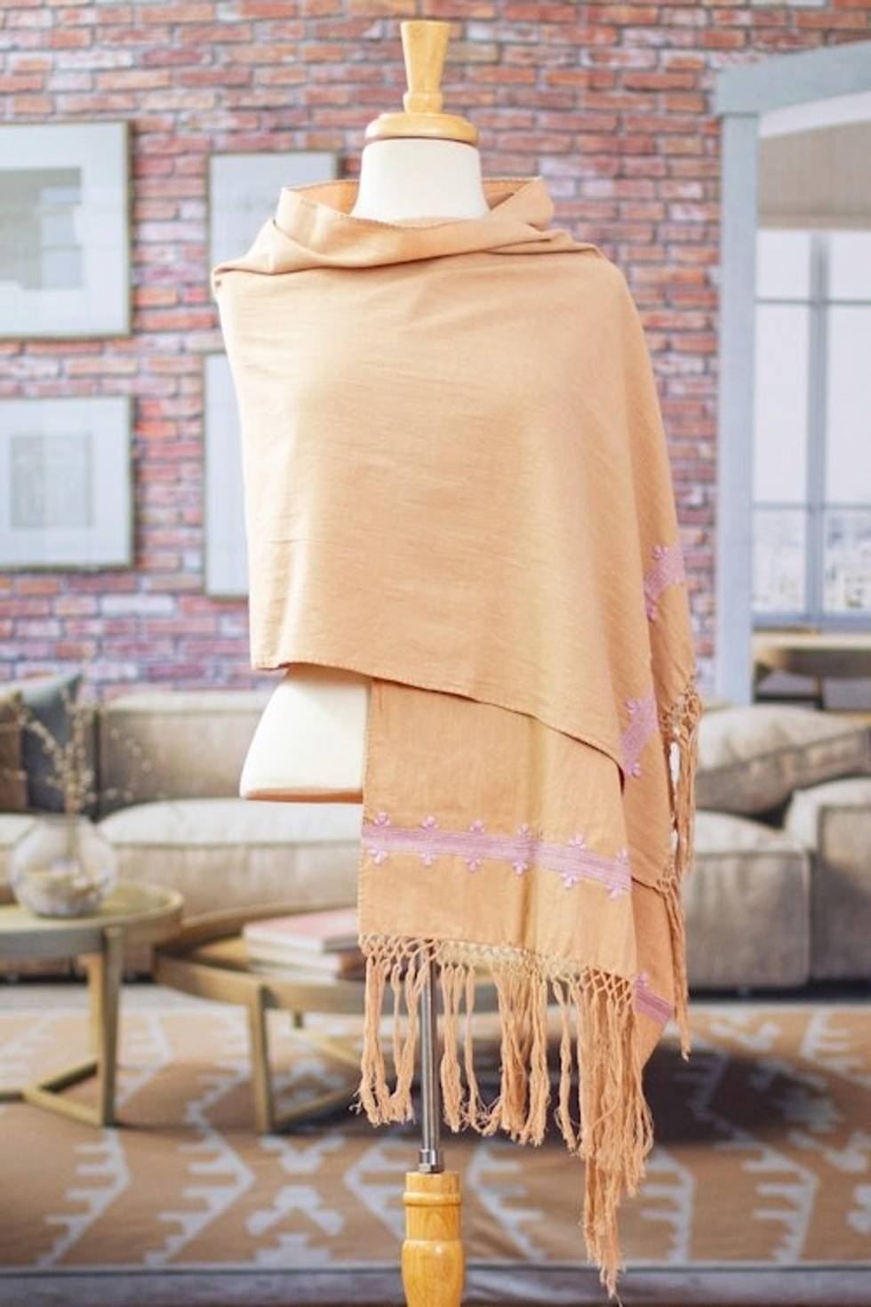 Pink Embroidered Cotton Shawl in a Solid Caramel Hue 'Empress's Pink Spirit' Item ID: 2671807531