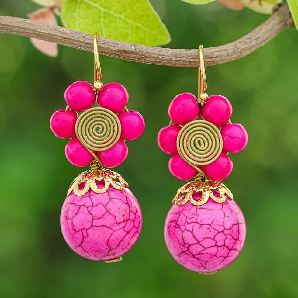 Pink Magnesite Floral Dangle Earrings with Brass Spirals 'Hot Pink Bloom' Item ID: 2671797877