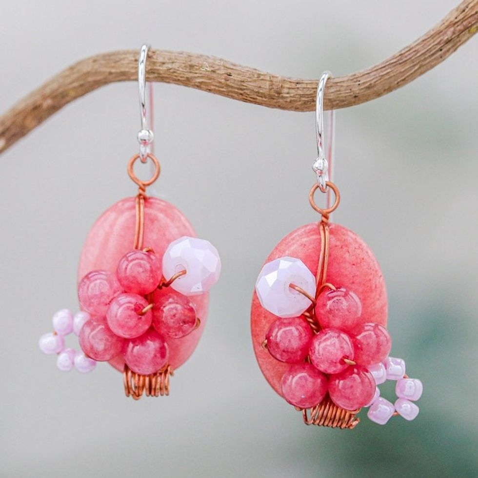 Pink Quartz and Glass Bead Dangle Earrings with Copper 'Garden Bliss in Pink' Item ID: 2669930496