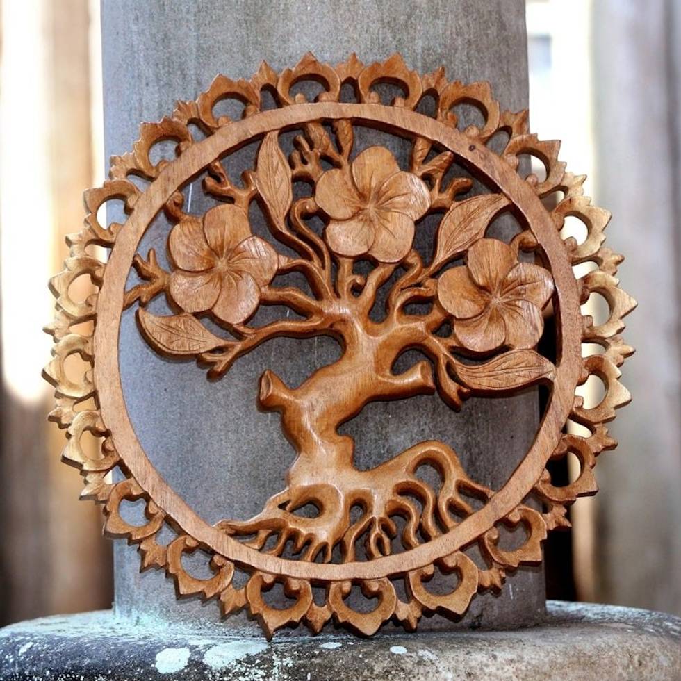Plumeria Tree Hand-Carved Circular Wood Relief Wall Panel 'Jepun's Aura' Item ID: 2671736846