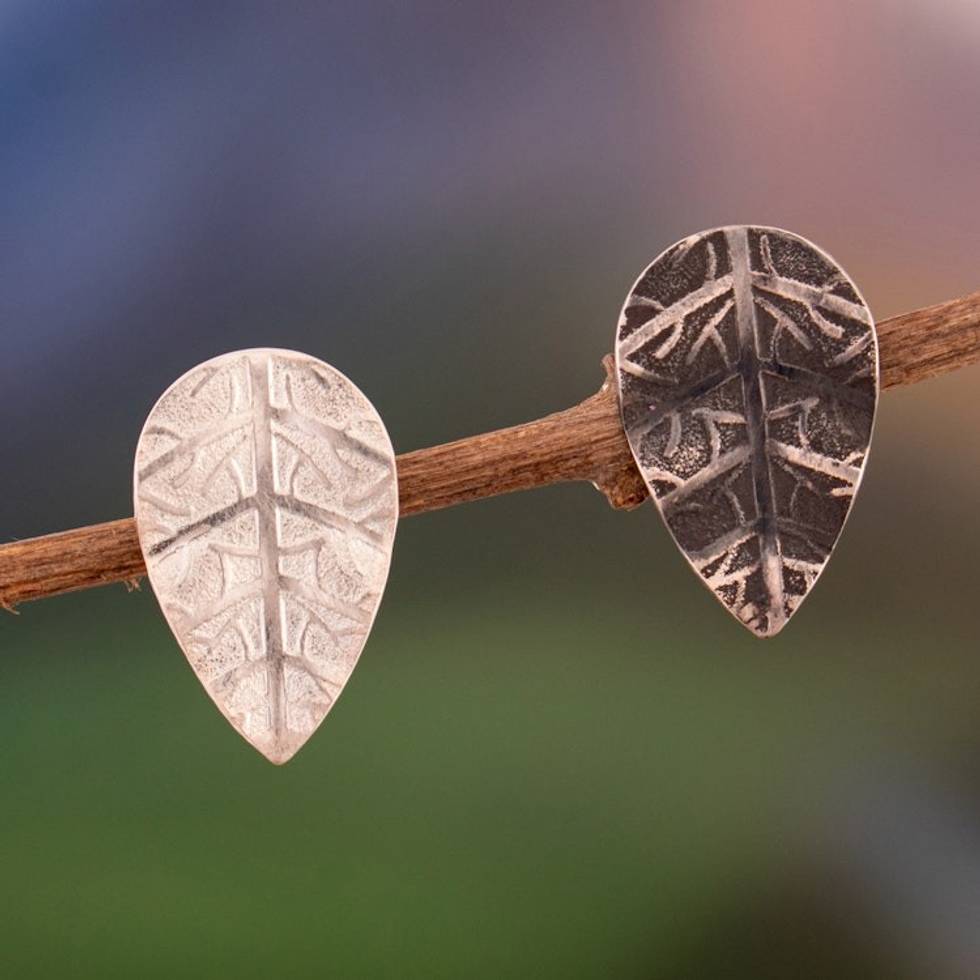 Polished and Oxidized Leaf Sterling Silver Button Earrings 'Opposing Leaves' Item ID: 2671697760
