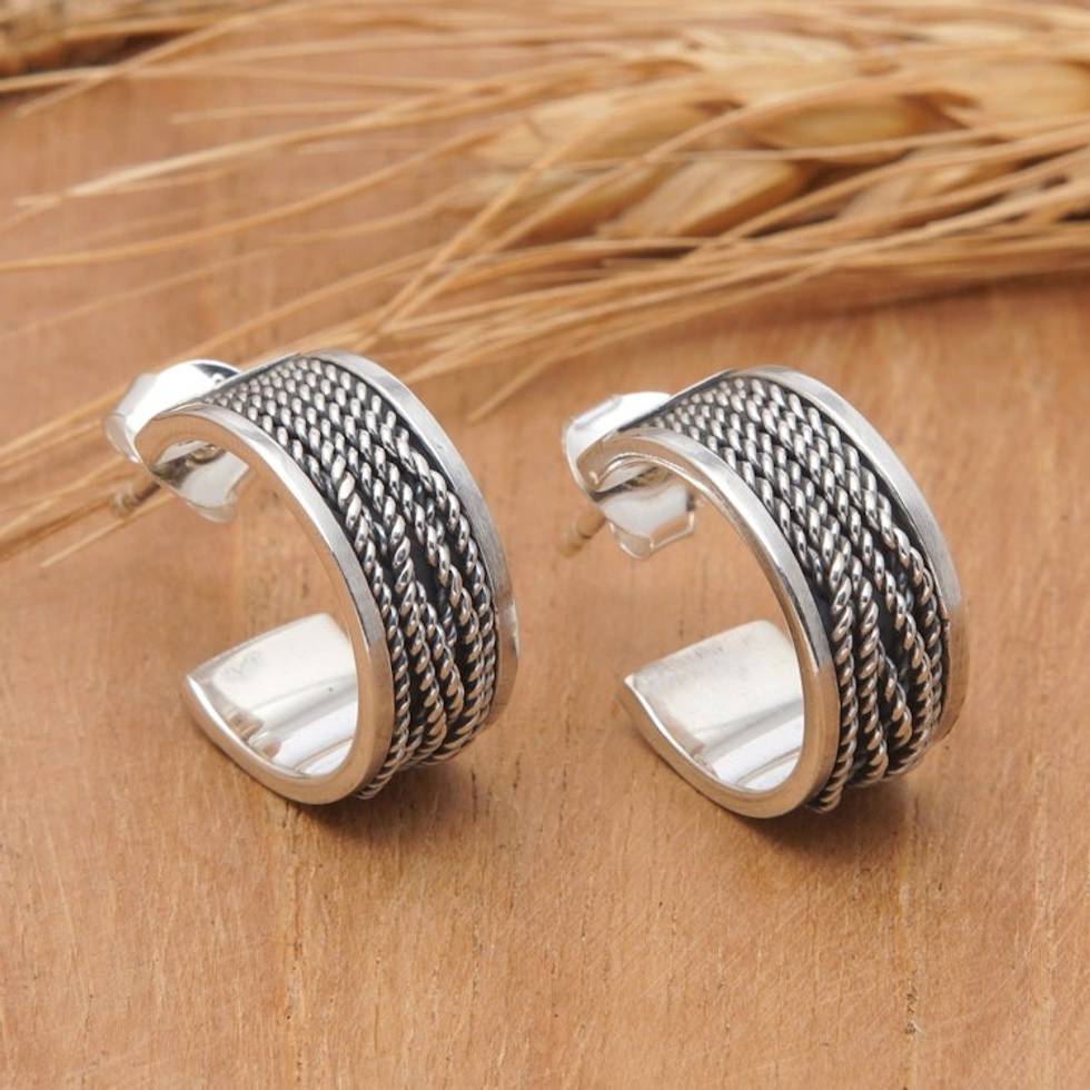 Polished and Oxidized Rope-Patterned Half-Hoop Earrings 'Weaving Harmony' Item ID: 2671765137
