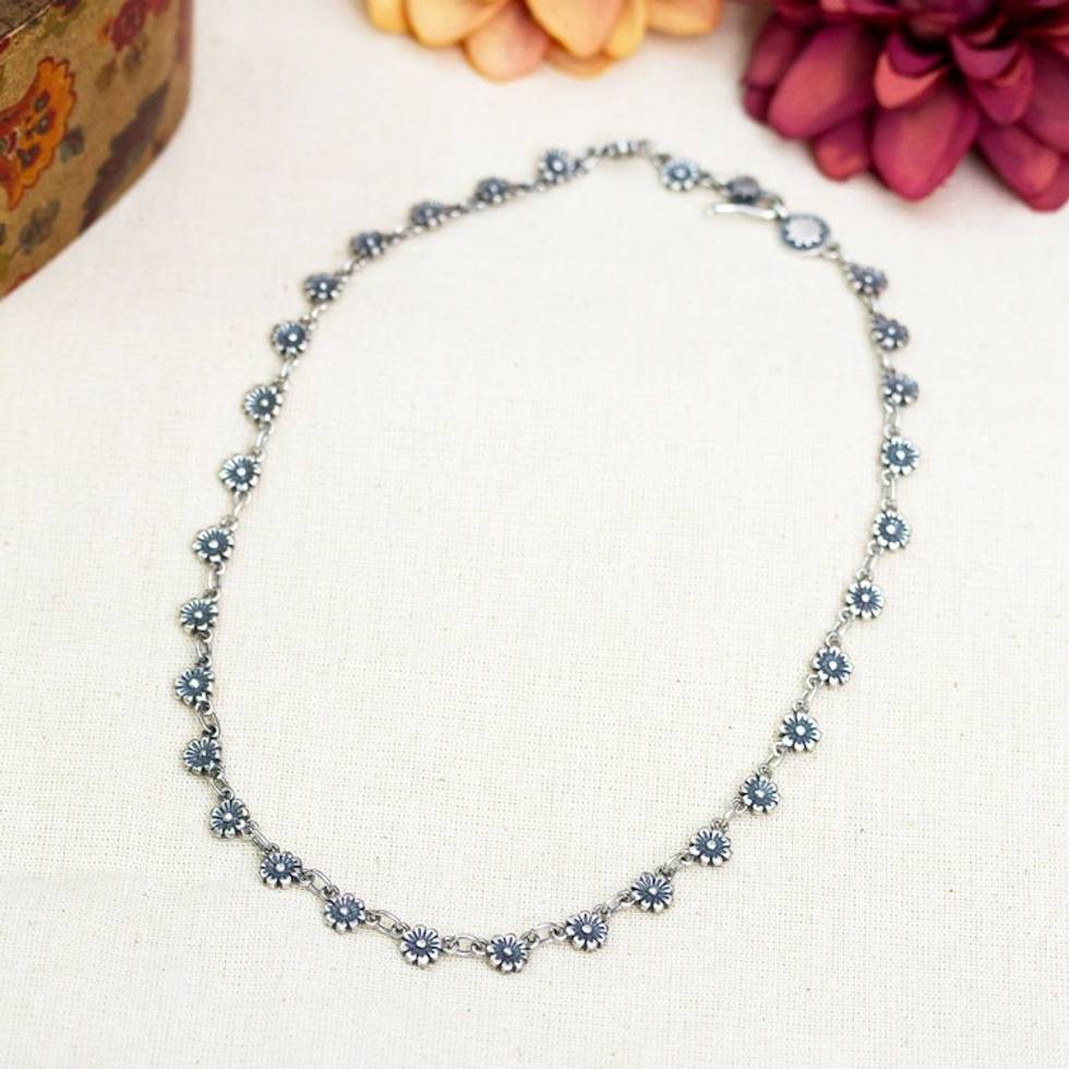 Polished and Oxidized Sterling Silver Spring Link Necklace 'Wild Petals' Item ID: 2671798559