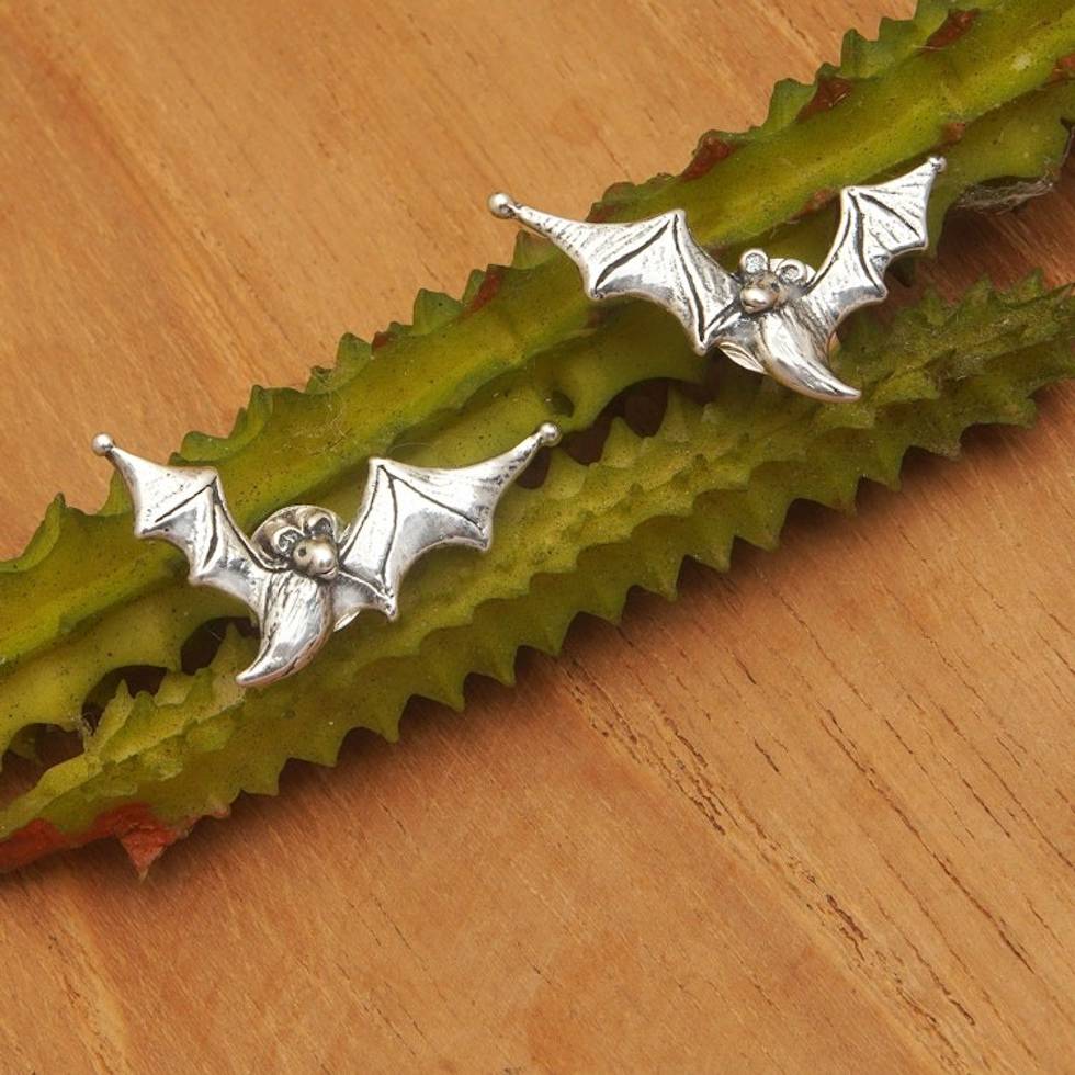 Polished Bat-Themed Sterling Silver Button Earrings 'Ethereal Bats' Item ID: 2671821165