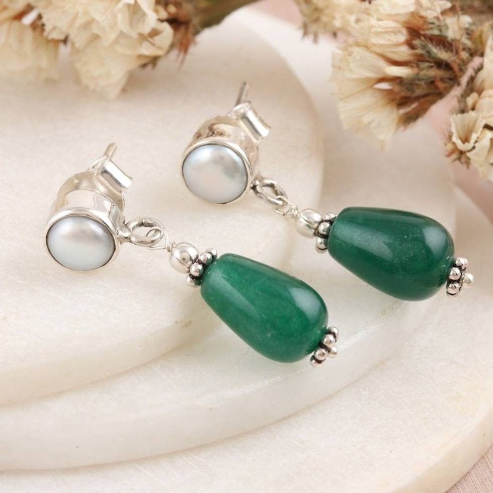 Polished Dangle Earrings with Cream Pearls and Green Onyx 'Feminine Intellect' Item ID: 2671786543