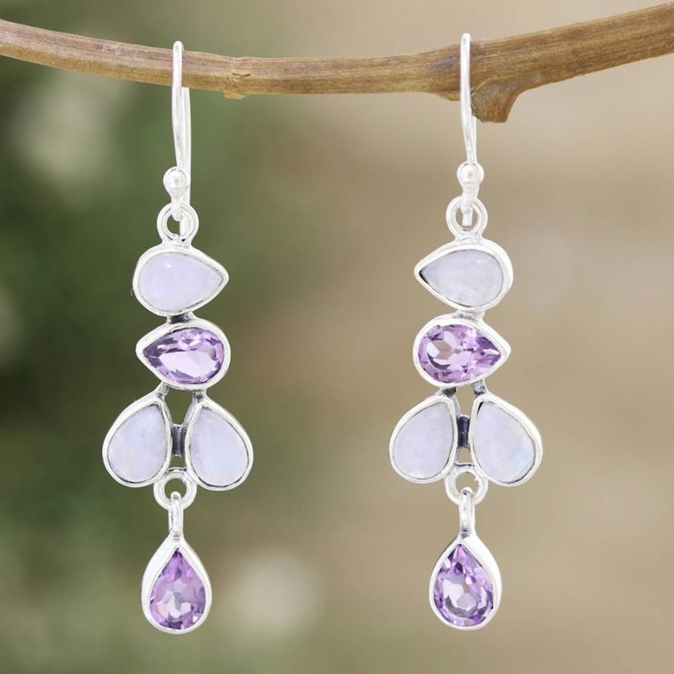 Polished Dangle Earrings with Rainbow Moonstone and Amethyst 'Tender Pears' Item ID: 2671787088
