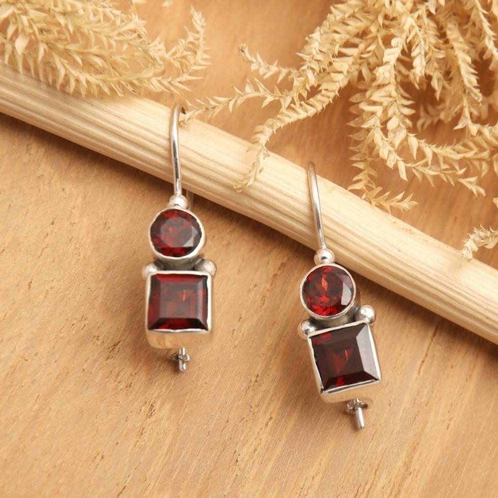 "Associated with perseverance since ancient times, these garnet stones in a round and square shape shine luxuriously today as Ketut Udiana's unique design enriches their vibrant and warm beauty. Crafted in Bali, these sterling silver drop earrings are the perfect complement to formal or casual outfits, totaling over one carat and featuring a faceted finish."