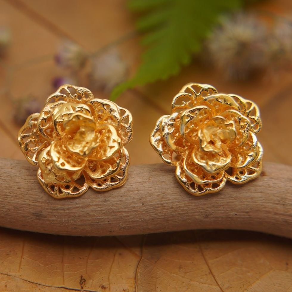Polished Floral 18k Gold-Plated Button Earrings 'Summery Rose' Item ID: 2669921880