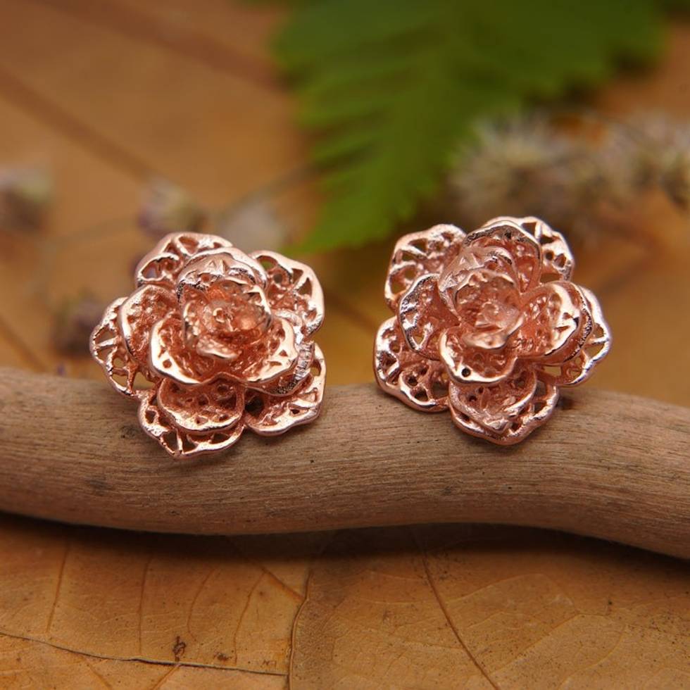 Polished Floral 18k Rose Gold-Plated Button Earrings 'Primaveral Rose' Item ID: 2671764716