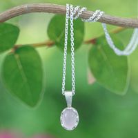 "Luminous, ethereal and tender, this rose quartz jewel glows with graceful beauty in Chatchanop Naratcharuj's newest pendant necklace. The Thai artisan uses sterling silver to create the floral-inspired structure holding the natural cabochon, whose enchanting colors symbolize compassion."
