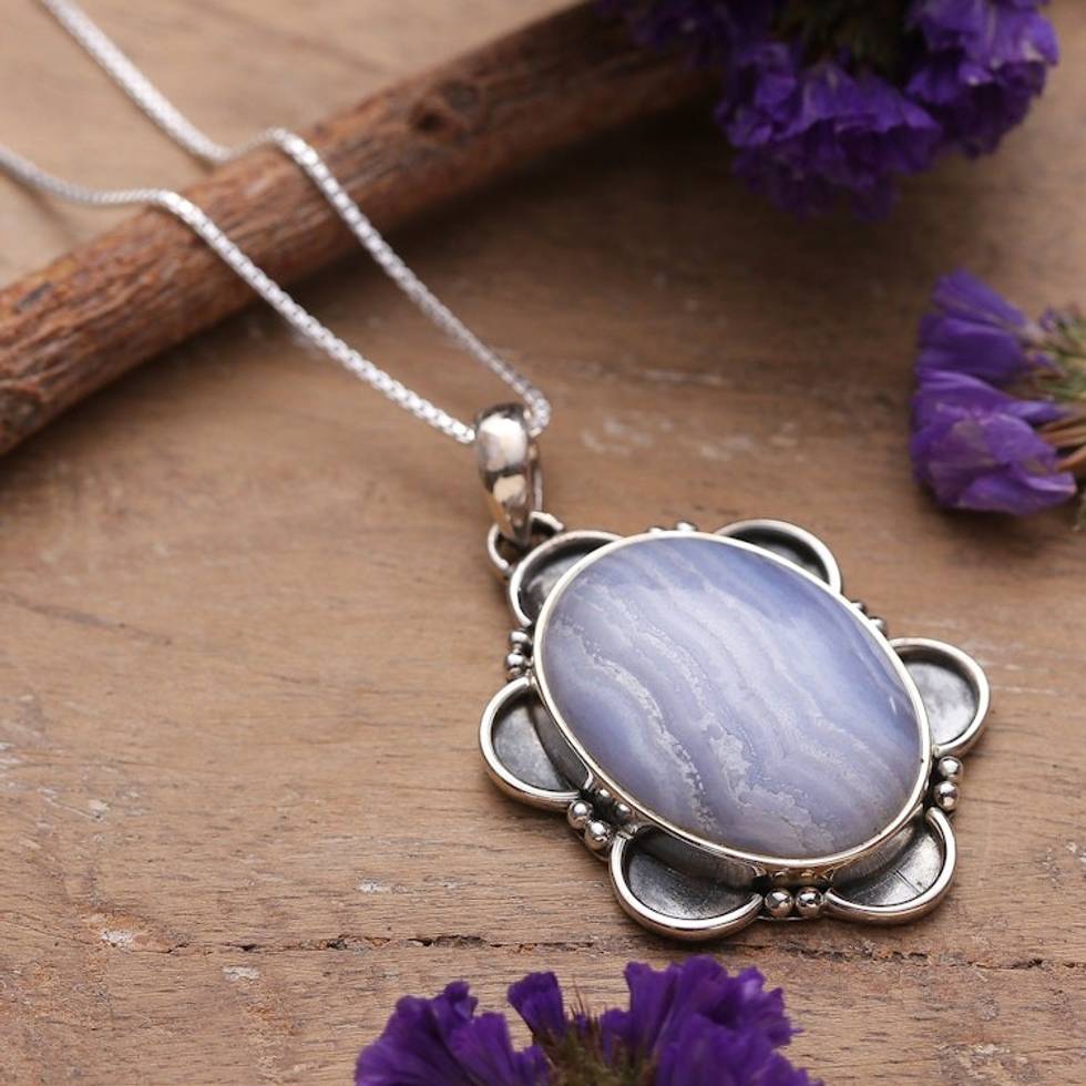 Polished Floral Sterling Silver and Agate Pendant Necklace 'Floral Lace' Item ID: 2671782616