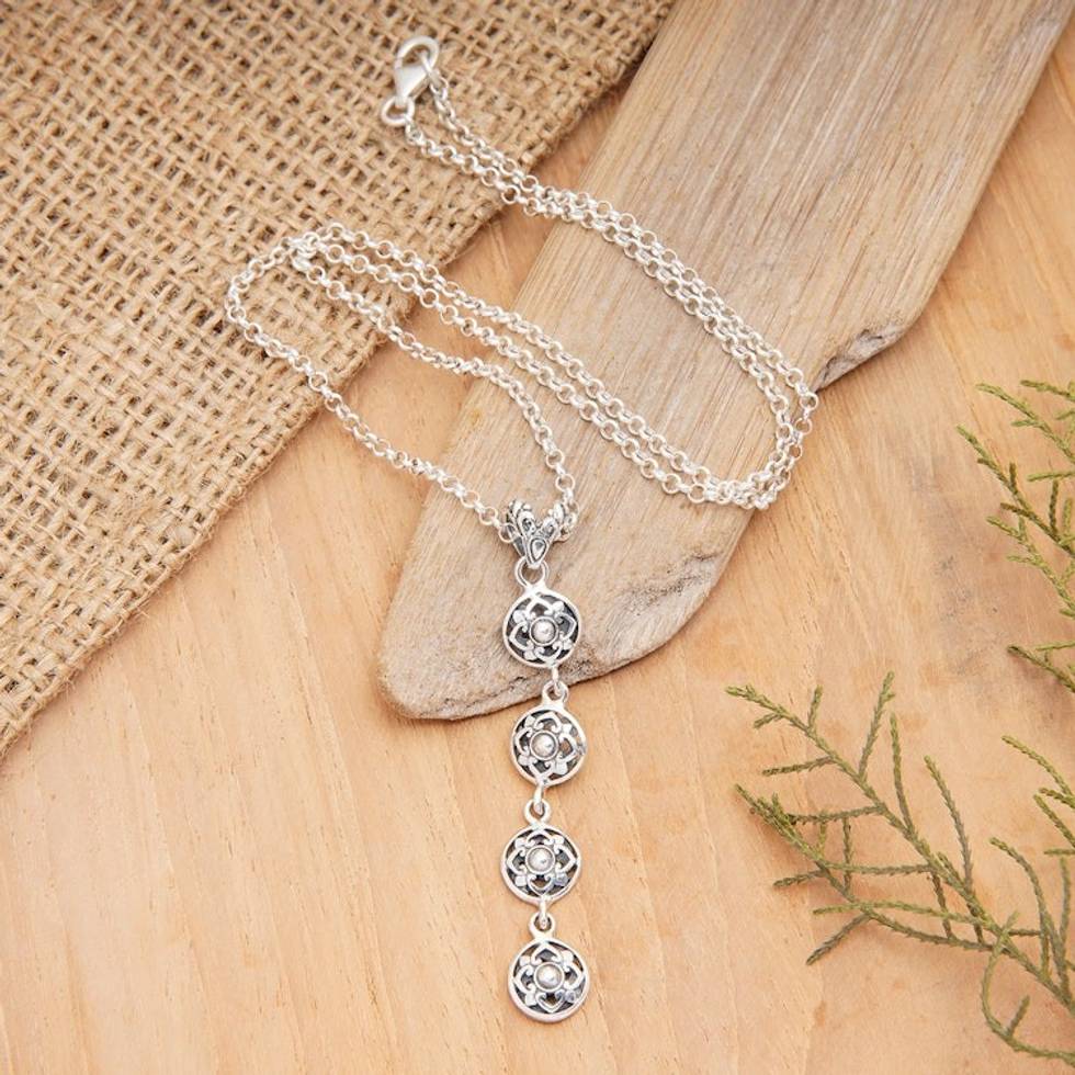Polished Floral Sterling Silver Y Necklace from Bali 'Flower Heart' Item ID: 2671764784