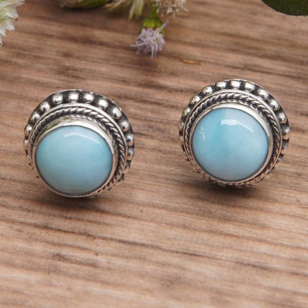 Polished Larimar Cabochon Button Earrings from Bali 'The Healing Sun' Item ID: 2669921852