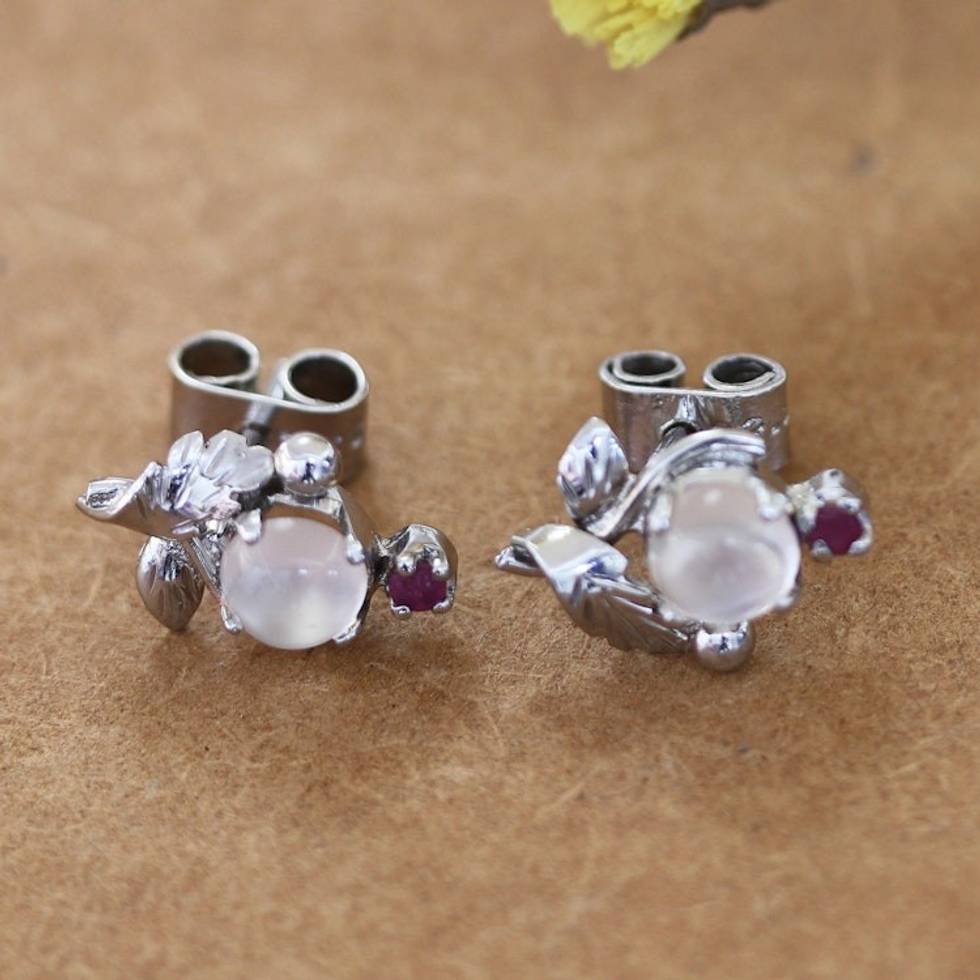 Polished Leafy Button Earrings with Moonstone and Ruby Gems 'Passion Talisman' Item ID: 2671786832