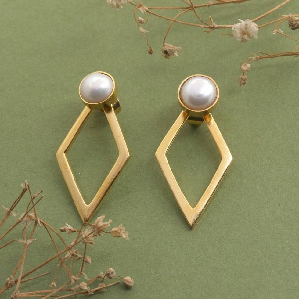 Polished Minimalist 18k Gold-Plated Pearl Drop Earrings 'Pearly Kite' Item ID: 2671764460
