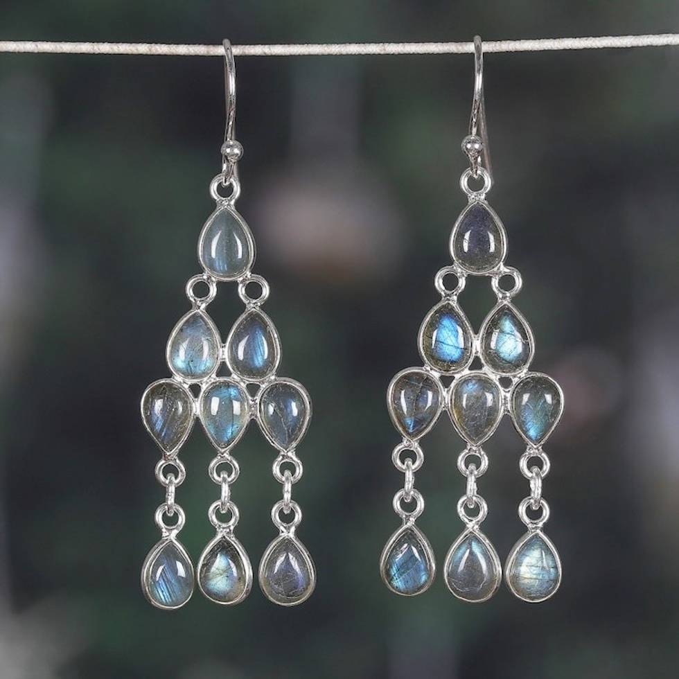 Polished Natural Labradorite Cabochon Chandelier Earrings 'Mystic Cascade' Item ID: 2671625563