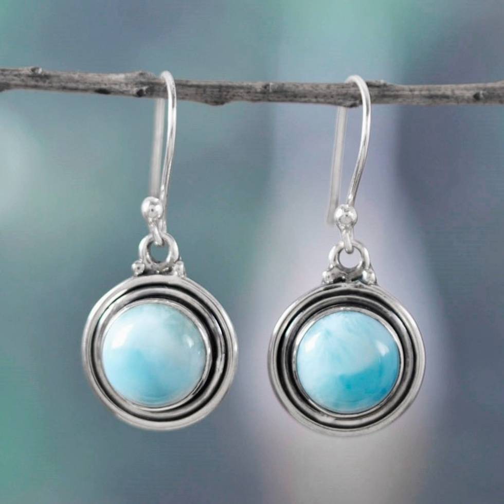 Polished Natural Round Larimar Dangle Earrings from India 'Regal Enchantment' Item ID: 2671786941