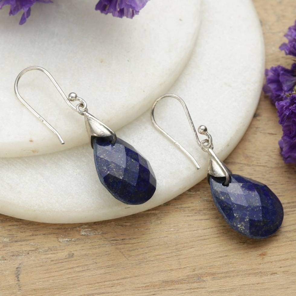 Polished Sterling Silver and Lapis Lazuli Dangle Earrings 'Sparkles of Blue' Item ID: 2671786708