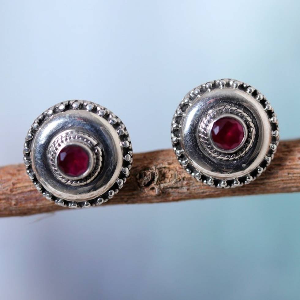 Polished Sterling Silver Button Earrings with Pink Onyx Gems 'Confidence Button' Item ID: 2671786627