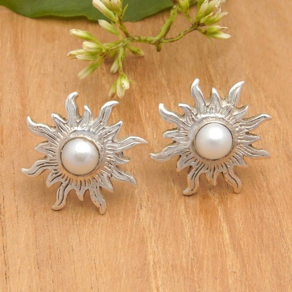 Polished Sterling Silver Sun Button Earrings with Pearls 'Pearly Sunlight' Item ID: 2671764199