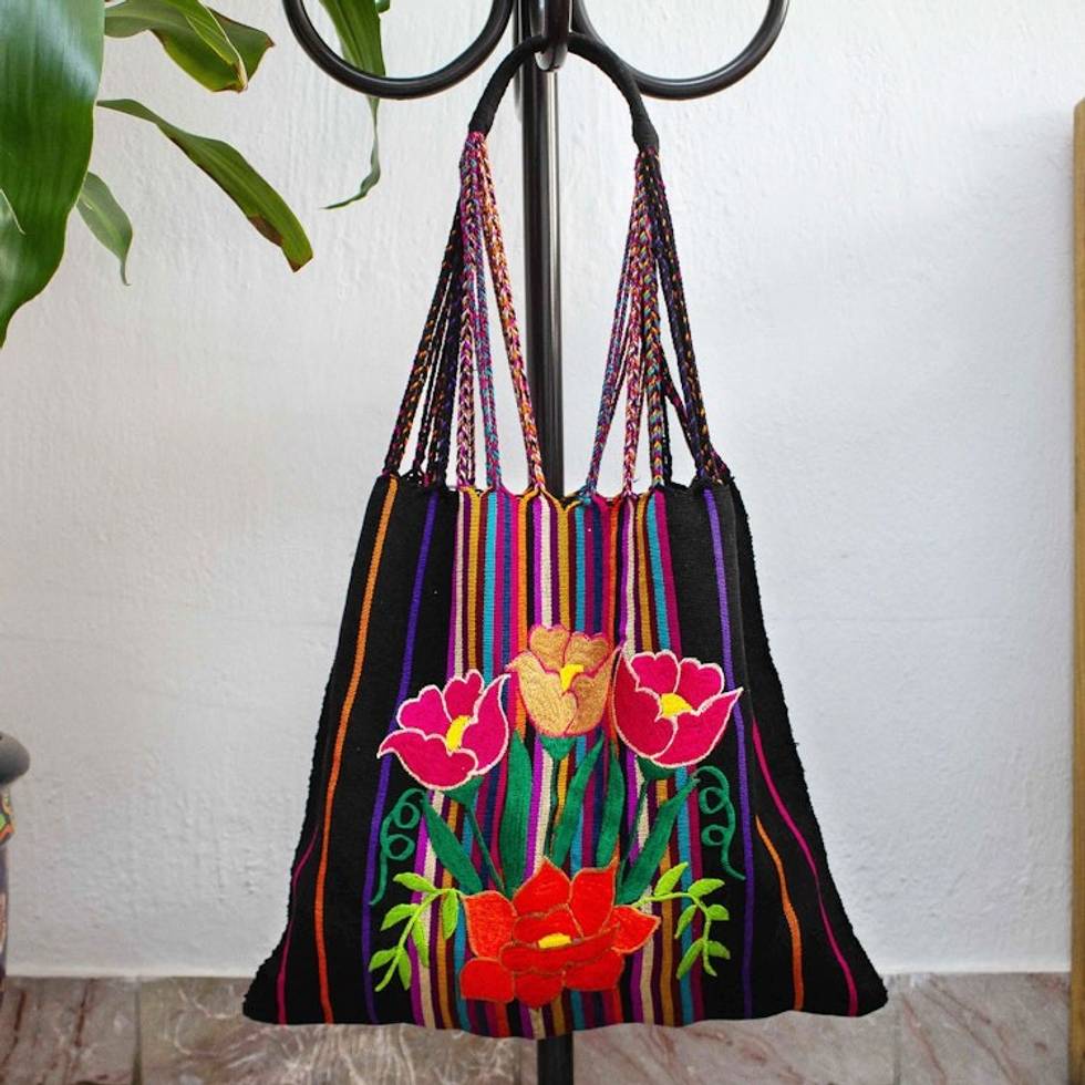Poppy Embroidered Handwoven Black Cotton Mexican Morral Tote 'Night Poppies' Item ID: 2669897662
