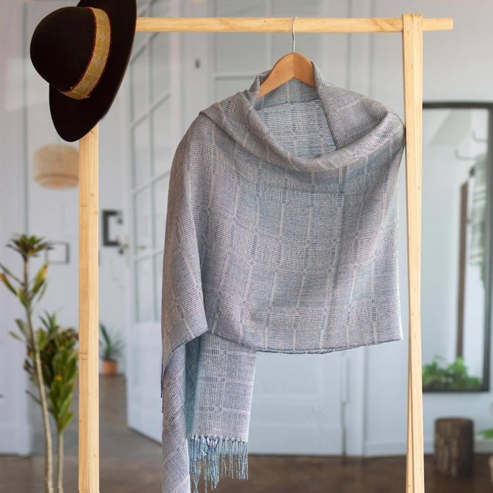 Powder Blue Patterned Handwoven Baby Alpaca Shawl 'Whispering Blue' Item ID: 2669891213