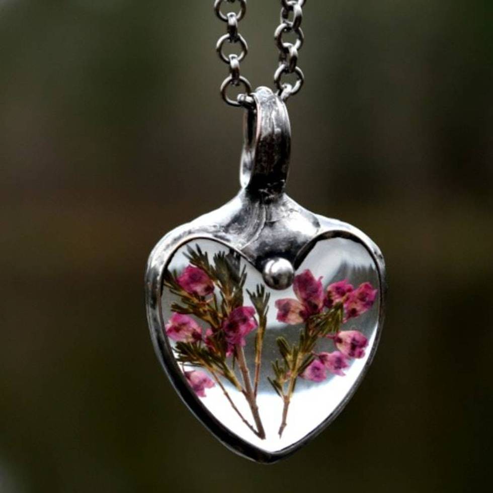 Pressed Flower Necklace for Women, Pink Scottish Heather Heart Pendant, Quality Glass Jewelry, Valentine's Day Gift for Her Item ID: 2672030803