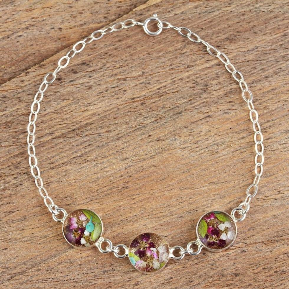 "The Del Toro Family of the Valley of Mexico captures tiny, delicate purple flowers to preserve forever in clear resin. They set these treasures in three pendants on a sterling silver chain bracelet."