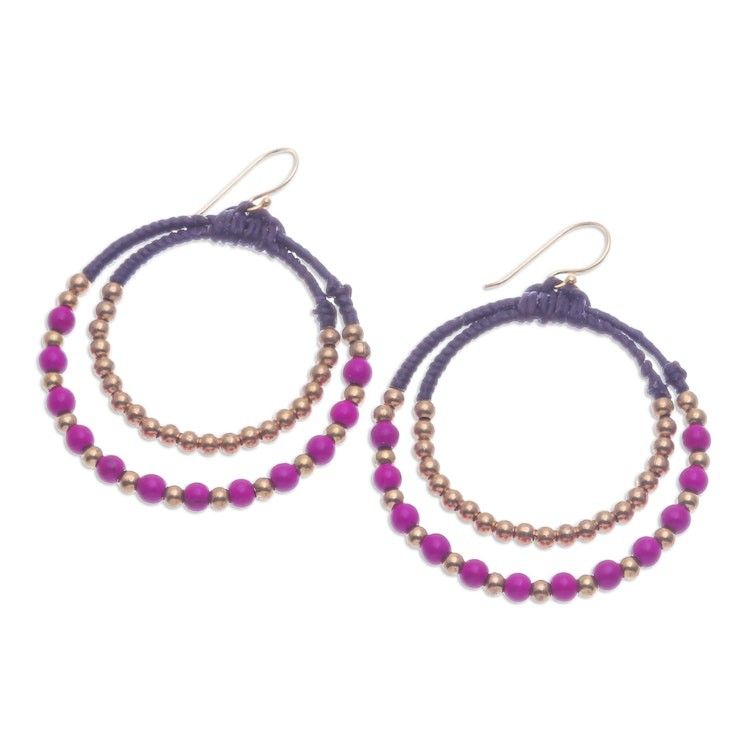 Purple Magnesite Brass Beaded Double Hoop Dangle Earrings 'Magenta Glam' Item ID: 2671797836
