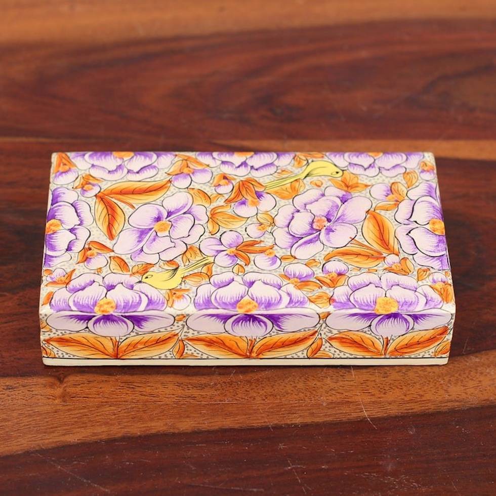 Purple Papier Mache on Wood Floral Leaf Bird Decorative Box 'Blooming Kashmir in Purple' Item ID: 2671783110