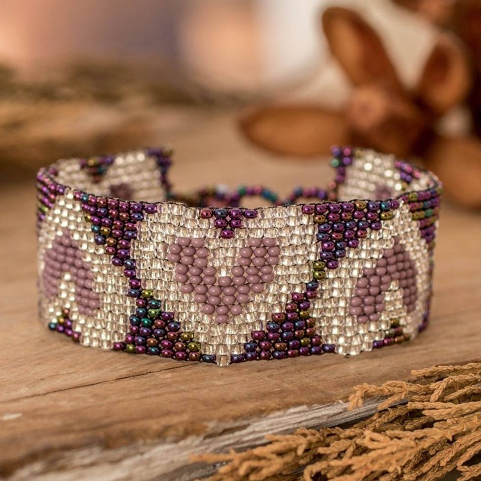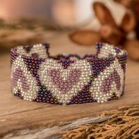 "Delicate glass beads dance in a romantic heart pattern across this adjustable wristband bracelet from Guatemala's Artisans of Panabaj. Lovely silver, lilac and purple hues meet practicality through a clever three-length crystal button fastening system."